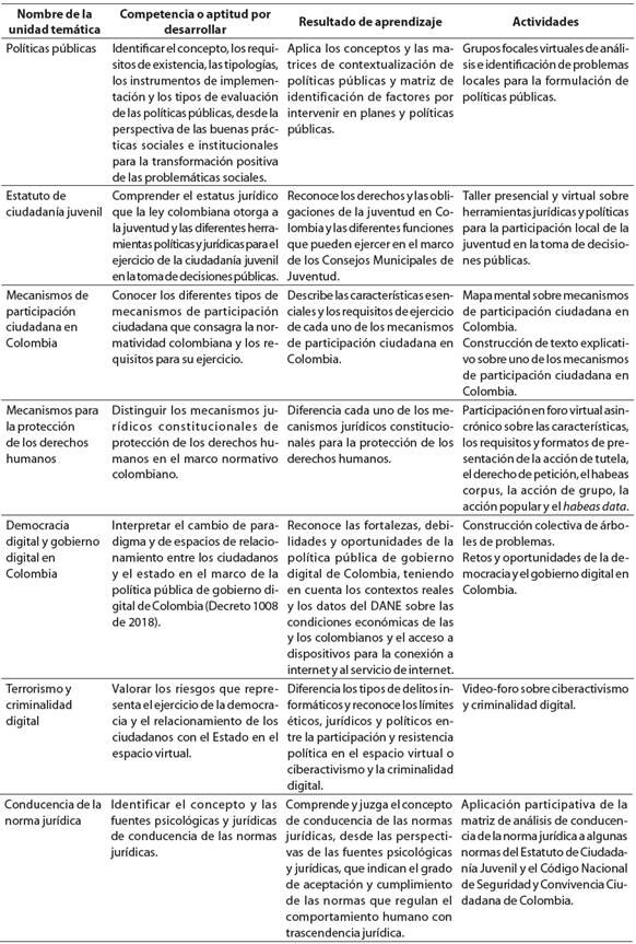 El curso virtual del programa piloto fue titulado "Ciudadanía juvenil, democracia digital y ciberactivismo en Colombia", y se alojó en la plataforma Moodle de la Universidad Santo Tomás Sede Medellín (USTA), en la cual se matricularon los 20 jóvenes participantes. Este curso contó con 40 horas de formación e interlocución con la juventud participante entre los meses de mayo y octubre de 2021, distribuidas en 20 horas de encuentros sincrónicos virtuales quincenales, 4 horas de encuentro presencial y 16 horas de trabajo asincrónico de la juventud con acompañamiento de los investigadores. Este curso fue certificado por la Universidad Santo Tomás Sede Medellín. En la tabla 1 se describen las unidades temáticas, competencias, resultados de aprendizaje y actividades ejecutadas con las y los jóvenes.