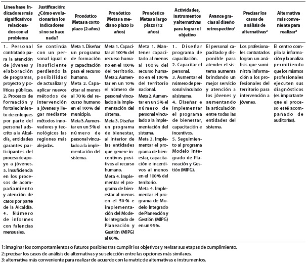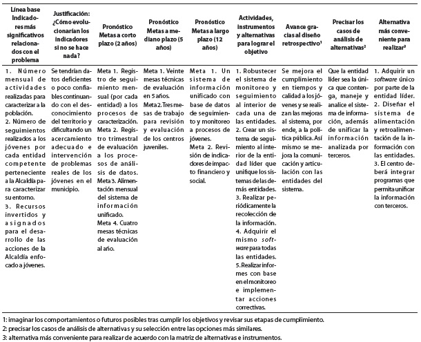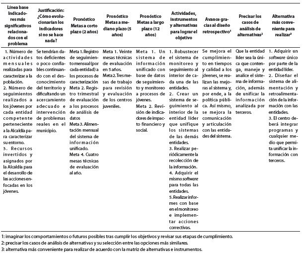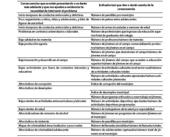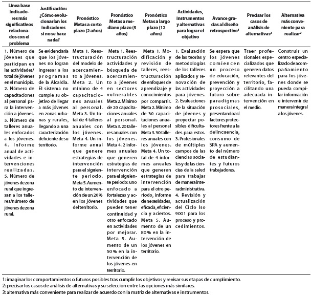 Ante las ya referidas condiciones generales del medio, la tabla 9 expone una propuesta para analizar la información compilada. Se exhibe, entonces, una línea base (que a través de indicadores mide algunas de las problemáticas críticas dentro del territorio), seguida de una posible consecuencia (en caso de no realizarse una intervención de estos problemas de manera sistemática). Para que este pronóstico se cumpla es necesario proponer metas y cambios basados en las mejores soluciones evidenciadas. Con ello, se pretende aportar al desarrollo pleno de la juventud.