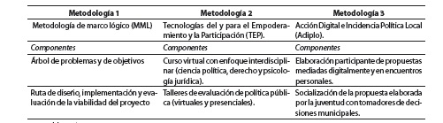 La tercera parte de esta apuesta por la innovación en la intervención y el acompañamiento social de la juventud Adiplo (acción digital e incidencia política local) fue una estrategia coconstruida con la juventud participante a través del proceso de coordinación desde el MML y las TEP basadas en el curso virtual "Ciudadanía juvenil, democracia digital y ciberactivismo en Colombia" (tabla 1). El proyecto original consideraba la acción solo en el marco del contexto virtual, pero las propuestas participantes entre la juventud y los facilitadores del curso llevaron a formular documentos de propuesta de política pública que se presentaron frente a los funcionarios en contextos de toma de decisiones de la municipalidad de Marinilla específicamente, lo cual redundaría en el fortalecimiento de la confianza y acción de los líderes juveniles que se presentaron a elecciones para el Concejo Municipal de la Juventud de Marinilla.