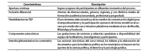 Con respecto al aporte de esta investigación y el programa piloto cabe resaltar el diseño del modelo multimetodológico de Investigación Acción Digital Local (IADL) que combinó tres metodologías: MML (Metodología de Marco Lógico); TEP (Tecnologías del Empoderamiento y la Participación); Adiplo (Acción Digital e Incidencia Política Local); este modelo funcionó de manera eficaz en este proyecto y pudo ser implementado para el trabajo con comunidades en el espacio virtual. Así mismo, esta investigación y el programa piloto implementado aportan un diseño de competencias y aptitudes de empoderamiento, resultados de aprendizaje y actividades para la formación de la juventud en el marco del Estatuto de Ciudadanía Juvenil (ver tabla 1), programa que puede ser replicado en los concejos municipales de juventud en los otros 1.002 municipios de Colombia.