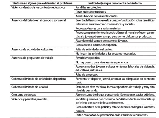 En primer lugar, se identificaron las principales problemáticas que enfrenta la juventud del municipio, desde la perspectiva y las herramientas para la formulación de políticas públicas propuesta por Velásquez (2021). Esta actividad se hizo con el fin de aplicar dichas herramientas con la juventud para el desarrollo de las competencias básicas y, simultáneamente, realizar el ejercicio de identificación de las problemáticas que se afrontan en el municipio. De esta forma, se pueden encontrar de manera colaborativa los caminos para su posible solución desde el ejercicio de la ciudadanía juvenil (tabla 4).