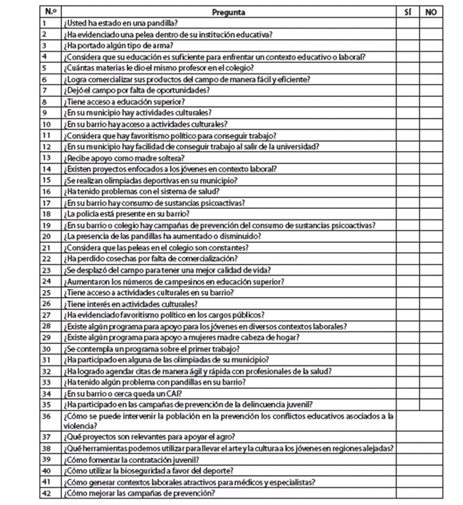 La observancia de tales condiciones alienta a los autores a generar un formato de encuesta que permita tanto caracterizar como exteriorizar las condiciones y necesidades que enfrenta el municipio de Marinilla, el cual fue diligenciado por la juventud participante en el programa piloto.