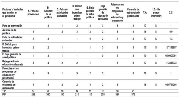 Por lo tanto, con la idea de visualizar una interrelación entre las problemáticas que enfrentan la juventud del municipio se empleó una matriz de Vester para puntuar los factores o las variables que inciden en el problema, tal como se observa en la tabla 6. Posteriormente, en la tabla 7, la interrelación entre las puntuaciones de la columna T.A. y la fila T.P. son graficadas en un plano cartesiano; con ello se exteriorizan las problemáticas más urgentes que enfrenta el municipio.