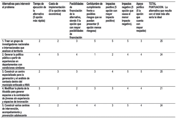 Para poder subsanar estos conflictos dentro del territorio se realizó una matriz de análisis de alternativas e instrumentos que expone soluciones mediante una lluvia de ideas que se realizó entre la juventud participante con el acompañamiento y la asesoría de los investigadores. Se obtuvieron las propuestas presentadas en la tabla 8.