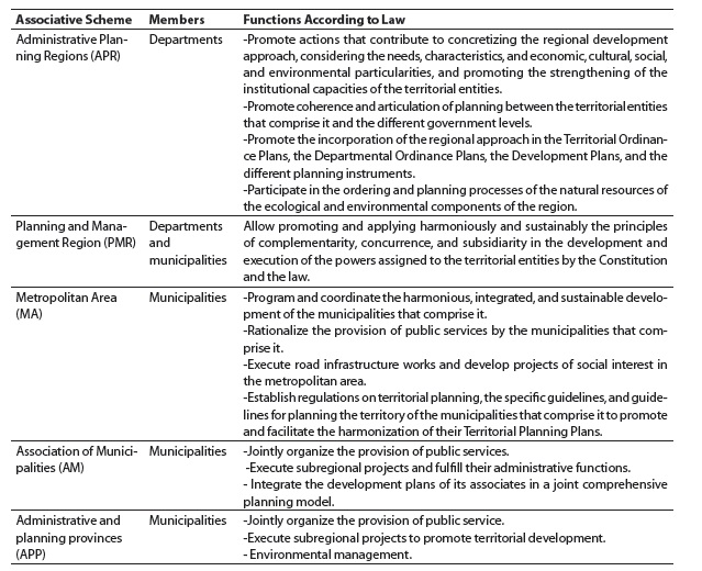 Territorial Associativity in Colombia is a principle of territorial planning and development that materializes with the formation of associations between territorial entities and integration instances to take advantage of economies of scale. It generates synergies and competitive alliances to achieve common development objectives. They will be promoted by the State and constituted freely and voluntarily for the autonomous and self-sustainable development of the communities (Congreso de la República, 2011). In line with this, territorial associative schemes are framed as figures of integration between territorial entities in Colombia. Currently, Metropolitan Areas, Associations of Municipalities, Provinces, Planning and Management Regions, and Administrative and Planning Regions are configured as Territorial Associative Schemes.