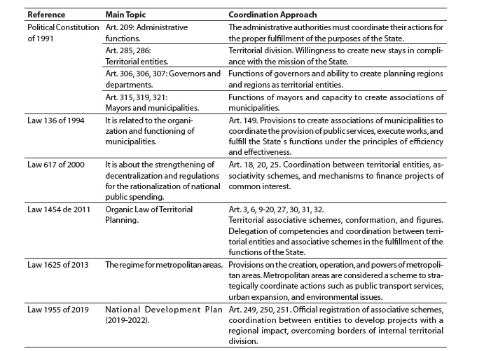 In general, the municipal associations -Metropolitan Areas, Associations of Municipalities, and Provinces- have in common the execution of impact overcoming the territorial division between municipalities, planning with scope in ordering and environmental management. This is in addition to having the municipalities as a scale of associates, contributing to territorial development through the provision of public services. All these have as a principle of action, the coordination between the associated actors and those involved in each activity. It is essential to point out that in the organization of the Colombian State, in addition to the departments, municipalities, and associative schemes, other actors are identified, such as the companies that provide public services, the Autonomous Environmental Corporations, the entities of the executive branch of the national order, among others. The associative legal framework is presented below with particular emphasis on the coordination that is intended to be obtained (Table 3).
