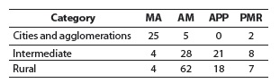 In the case of the associated municipalities in AM, most entities are rural (62), with a lower concentration of Cities and Agglomerations (less than 5%). This implies that this kind of associativity is being carried out by entities that do not have a high population density and territories that may be potentially disconnected. Likewise, this associativity concentrates on municipalities with low resources, 89% of which are Category Six and 5% are Category Five. This distribution shows that small municipalities with scarce resources may use associativity as an action strategy.
