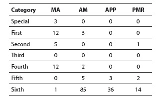 Additionally, Table 5 shows the distribution of the same entities, considering the distribution provided in Law 617 of 2000, which categorizes the municipalities according to their administrative and fiscal management capacities, measure based on the size of the population and the value of the current annual income. According to this categorization, the municipalities with a population of more than 500,001 inhabitants and whose current unrestricted yearly income exceeds 400,000 monthly legal minimum wages are considered Special. Those with a population between 100,001 and 500,000 inhabitants and whose annual current free income exceeds 100,000 and up to 400,000 monthly legal minimum wages are classified as "First," and the category gradually descends as they have less population and less free current income destination.