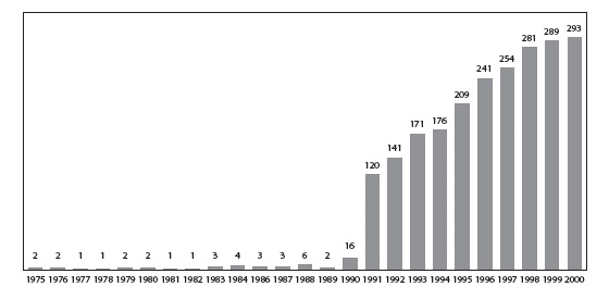 La producción académica mundial tiene su auge en los años setenta. De acuerdo con los datos bibliográficos WOS, en 1975 se presentan los dos primeros artículos que tratan sobre mecanismos causales. Uno asociado a la medicina (Poswillo, 1975) y un segundo a las ciencias sociales, más específicamente a la economía y la planificación urbana (Stefflre, 1975). No obstante, el incipiente interés a finales de esta década solo llevó a un total de 8 artículos académicos, que se concentraron en las ciencias biológicas, médicas, neurociencias y una sola en ciencias sociales. Esta dinámica se mantuvo en los siguientes años. En la década de los ochenta, la producción académica subió a 25 artículos agrupados en países como Estados Unidos, Inglaterra y Japón, y principalmente en disciplinas como la medicina, la genética y la paleontología. Este panorama se mantuvo desde la década de los noventa hasta el 2000, en donde las investigaciones que teorizaban o utilizaban mecanismos causales tuvieron un repunte con un total de 2.190 artículos (figura 3). No obstante, las ciencias sociales no tuvieron ninguna producción.