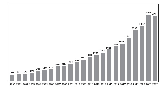 Las publicaciones en ciencias sociales en la década de 2000 hasta 2022, se caracterizan por tener a la ciencia política como impulsora de esta metodología sobre otras disciplinas. La figura 4 muestra una fluctuación con respecto a la producción académica en ciencias sociales a nivel mundial, que tiende a ser ascendente desde 2011, siendo el 2021 el año con el mayor número de publicaciones y mostrando solo un pequeño descenso en la producción en el 2022.