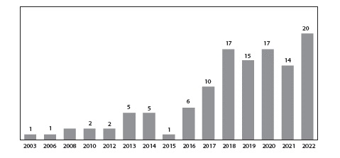 La producción académica sobre mecanismos causales se concentra particularmente en Estados Unidos y Canadá, seguido por algunos países europeos. Esto es evidente en la producción anglosajona que presenta un vasto desarrollo teórico, analítico y empírico. En ciencias sociales, Estados Unidos cuenta con 1.154 producciones, seguido de 341 en Inglaterra y Canadá con 126 artículos, abarcando casi el 67 % de la producción a nivel mundial. Mientras tanto, América Latina llega a las 118 publicaciones desde 2003 hasta 2022. El registro en WOS muestra un primer artículo teórico alrededor del cual se tratan las limitaciones del uso de esta metodología, pero también la necesidad para las ciencias sociales de aplicarla (Ratton y Morais, 2003); esta producción aparece en una revista brasileña. Posterior a este, en 2006 se retoma el debate en América Latina con una investigación que aborda la incidencia de la división central-local en los sistemas políticos, construyendo un mecanismo causal con base en un modelo de actores que aplica en dos estudios de caso del sistema federal mexicano (Schiavon, 2006). Como se observa en la figura 5, el crecimiento entre 2003 y 2015 en las 12 subáreas seleccionadas en este artículo es fluctuante, mientras que desde 2016 se presenta un crecimiento exponencial de la metodología en las ciencias sociales en América Latina.