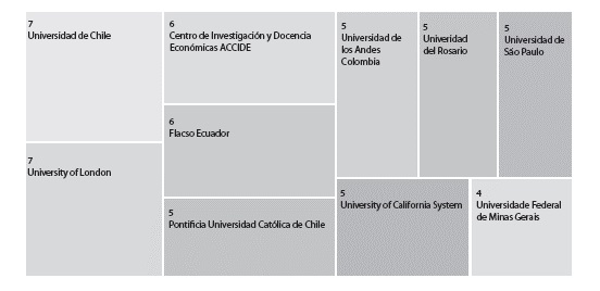 De otro lado, la afiliación de autores (figura 6) muestra una concentración en la producción en Chile, Inglaterra, México y Ecuador. La Universidad de Chile, el Centro de Investigación y Docencia económicas AC (CIDE) y Flacso Ecuador, son las principales afiliaciones institucionales de los autores latinoamericanos. En menor medida, universidades brasileñas, colombianas, europeas y norteamericanas. Los principales autores exponentes en la región son Antonie Maillet, profesor asociado de la Universidad de Chile, y Guillaume Fontaine, profesor titular de Flacso Ecuador, con 3 y 6 artículos respectivamente. Maillet, con dos artículos publicados en revistas latinoamericanas (Revista de Ciencia Política, Revista del CLAD) y un artículo publicado en una revista italiana (Partecipazione e conflitto). Estos presentan un corte más hacia los estudios de caso, mientras que uno es una introducción a la inferencia causal.
