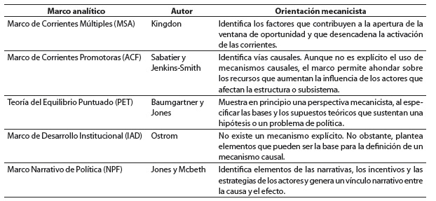 En los últimos años, el interés de las políticas públicas ha estado puesto en la causalidad. Principalmente, los enfoques de política se han definido a partir de dos grandes corrientes derivadas de la propuesta seminal de Laswell. Por un lado, dentro de la teoría del proceso de política (Sabatier, 2007), los marcos analíticos aplicaron de manera implícita la causalidad. La investigación realizada por van der Heijden et al. (2019) asocia la orientación mecanicista a los principales marcos del análisis de política. Si bien estos no plantean un mecanismo causal, buscan explicar resultados de política a partir de fases, emprendedores, el rol de las coaliciones, las coyunturas críticas o los elementos narrativos que se consideran como componentes propicios para el desarrollo de una cadena causal.