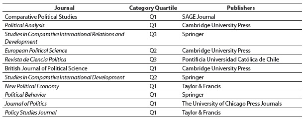La ciencia política integra el mayor número de investigaciones alrededor de los mecanismos causales. Además, es tal vez el área con mayor número de artículos y revistas asociadas al estudio de las políticas públicas. Dentro de esta disciplina se destacan autores como Derek Beach (Aarthis University), Jeb Barres (University of Southem California), John Gerring (University of Texas Austin), Nicholas Weller (University of Southern, Los Angeles), James Mahoney (Northestern University), Aníbal Pérez-Liñán (University of Notre Dame) y Charles Tilly (Columbia University), que son citados constantemente en la literatura sobre policy design o la teoría del proceso de política (policy analysis). Por otro lado, en cuanto a los artículos con mayor citación, se encuentra en primer lugar el texto de Tulia Falleti y Julia Lynch, "Context and causal mechanisms in political analysis", en el Journal Comparative Political Studies, con 354 citas y, en segundo lugar, el texto de John Gerring "Causal mechanisms: Yes, but", en el Journal Comparative Political Studies, con 116 citaciones. La producción desde la ciencia política se concentra en bases de datos como Sage (172 artículos), Cambridge University Press (163 artículos), Taylor & Francis (107 artículos) y, en menor medida, Elsevier (17 artículos). La tabla 3 identifica las principales revistas vinculadas a la ciencia política, en las que se integran temáticas asociadas al análisis o el diseño de las políticas públicas. En esta se destaca la Revista de Ciencia Política como publicación latinoamericana.