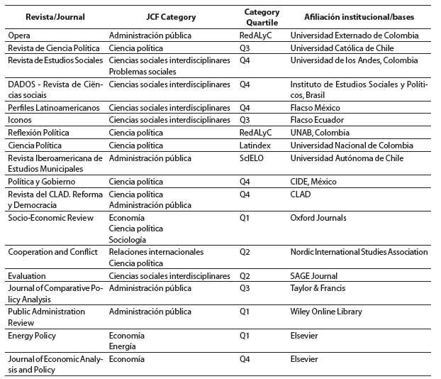 Las investigaciones sobre políticas públicas presentan menores resultados. No obstante, la producción de esta subdisciplina está en ascenso y se agrupa en diferentes áreas académicas de las revistas regionales o del Norte global. Cabe resaltar que no existe un filtro específico en WOS para el estudio de las políticas públicas, por lo que las investigaciones disciplinares se agrupan principalmente en revistas especializadas de administración pública, ciencia política, economía y ciencias sociales interdisciplinares. En torno a esto, la tabla 4 muestra una revisión de las principales revistas tanto latinoamericanas como europeas con artículos de autores latinoamericanos o con filiación institucional en la región.