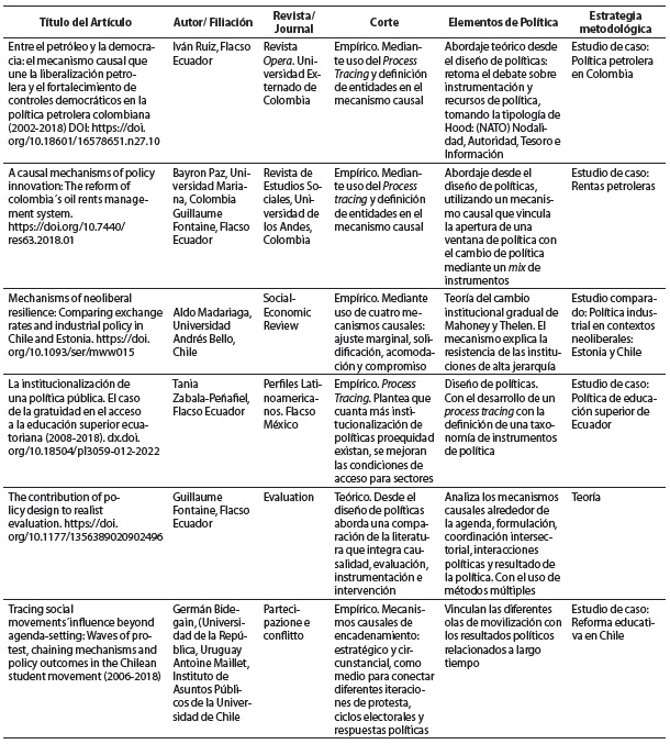 En torno a esta caracterización, y a partir de algunos artículos hallados en disciplinas como la economía, la ciencia política, las ciencias sociales y la administración pública, este artículo definió aquellos más orientados al estudio de las políticas públicas y caracteriza el abordaje metodológico alrededor de los mecanismos causales que utilizan. Para la selección de casos, se realiza una revisión previa sobre los 118 artículos o capítulos de libro en la región, y se seleccionan artículos relacionados con las principales afiliaciones de autores y autoras en ALC. Para el estudio se define si tienen un corte analítico, teórico o empírico; los elementos de política pública que analizan; la estrategia metodológica que utilizan (estudio de caso o comparación), y los desafíos que plantean para el estudio de las políticas públicas (tabla 5).