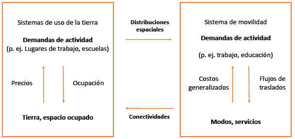 Existe una interacción teórica entre el uso de la tierra y la movilidad. Una significativa inversión en transporte cambiará el perfil de la accesibilidad en el área metropolitana, el atractivo del suelo y el desarrollo económico. Un importante desarrollo de programas de viviendas nuevas e inmobiliarios cambiará los patrones de demanda de movilidad de una metrópoli e impactará en los servicios de transporte público e infraestructura de conectividad (figura 2).