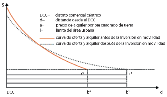 Alonso (1964) formalizó esta teoría basándose en el trabajo seminal de Von Thunen y derivando la función de oferta-alquiler para opciones de localización urbana. Según este modelo, la utilidad de un agente de localización depende del consumo de un bien generalizado, el tamaño de la propiedad y la distancia al distrito comercial central. La función oferta-alquiler resultante representa la cantidad que un agente está dispuesto a pagar por el alquiler en distintos espacios o localizaciones, con diferentes distancias al distrito central de negocios (DCC), mientras mantiene una utilidad constante. Según esta teoría, los costos de transporte en dinero y tiempo dictan la forma de la curva (figura 3).
