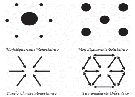 Un sistema es policéntrico no solo si contiene varios centros separados por una jerarquía plana, sino que las conexiones entre los nodos tienen que ser equilibradas, sin una centralización completa de los flujos hacia el núcleo ya que las regiones policéntricas se caracterizan por más de una centralidad. En la figura 6 se observa que el territorio monocéntrico se caracteriza por un centro dominante, y la estructura policéntrica en términos morfológicos se caracteriza por una distribución equilibrada de los nodos y, en términos funcionales, por unos flujos en red entre los nodos.