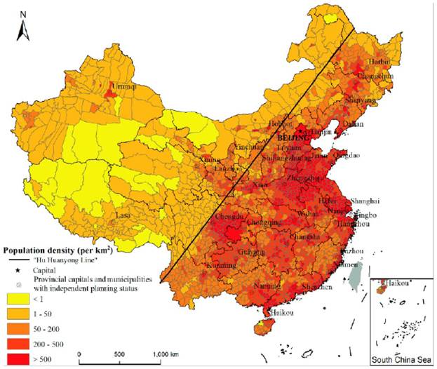 La importancia estratégica de las rutas marítimas comerciales que atraviesan el mar de China Meridional está relacionada, también, con las transformaciones que el crecimiento económico de este país ha producido en la distribución geográfica de la sociedad china. El desarrollo del tejido industrial impulsó el proceso de urbanización de la sociedad con el desplazamiento de gran parte de la población desde el interior del país a las ciudades industriales y portuarias de la costa (Zhibin y Anjiao, 2018). Actualmente, las provincias costeras concentran la mayor parte de la población, lo que ha dado origen a la línea Heihe-Tengchong que divide diagonalmente el país desde la ciudad de Heihe, en el noreste, hasta Tengchong en el suroeste. La mitad oriental concentra aproximadamente el 95% de la población, que se ubica en las provincias próximas al mar, en una extensión que representa el 43% del total del territorio chino, mientras que el 5% restante vive en la mitad occidental que representa el 57% del territorio (mapa 2).