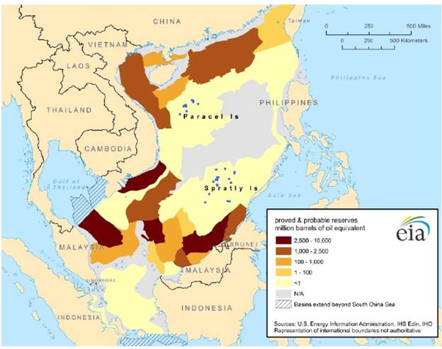 Por otro lado, se resalta la presencia de importantes yacimientos de petróleo y gas que se estima que el mar de China Meridional alberga en el subsuelo del fondo marino, lo cual hace que esta zona tenga especial interés para el Estado chino. Tal es así, que algunos analistas han llegado a afirmar que este mar tiene el potencial para convertirse en un segundo golfo Pérsico (Erickson y Goldstein, 2009), pues se estima que sus reservas de hidrocarburos ascienden a un valor total de no menos de 2,5 billones de dólares (Lieser, 2021). Este es otro factor más que convierte el control de este mar en un asunto de especial relevancia para China debido al crecimiento de su demanda de hidrocarburos durante los últimos años, pues le permitiría reducir su dependencia del petróleo procedente del golfo Pérsico. Todo esto contribuye a incrementar la presión geopolítica sobre esta área geográfica disputada (mapa 3).