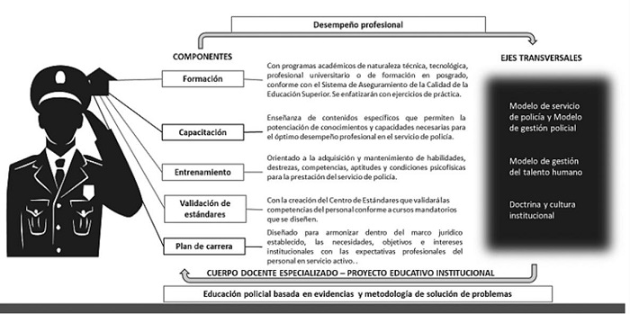 De esta manera, se inicia un nuevo modelo de profesionalización policial en el que se definen cinco componentes: formación inicial, capacitación, entrenamiento, validación de competencias y un plan de carrera con lineamientos específicos asociados con las tendencias y proyecciones en cuanto a calidad educativa y las expectativas del desempeño profesional.