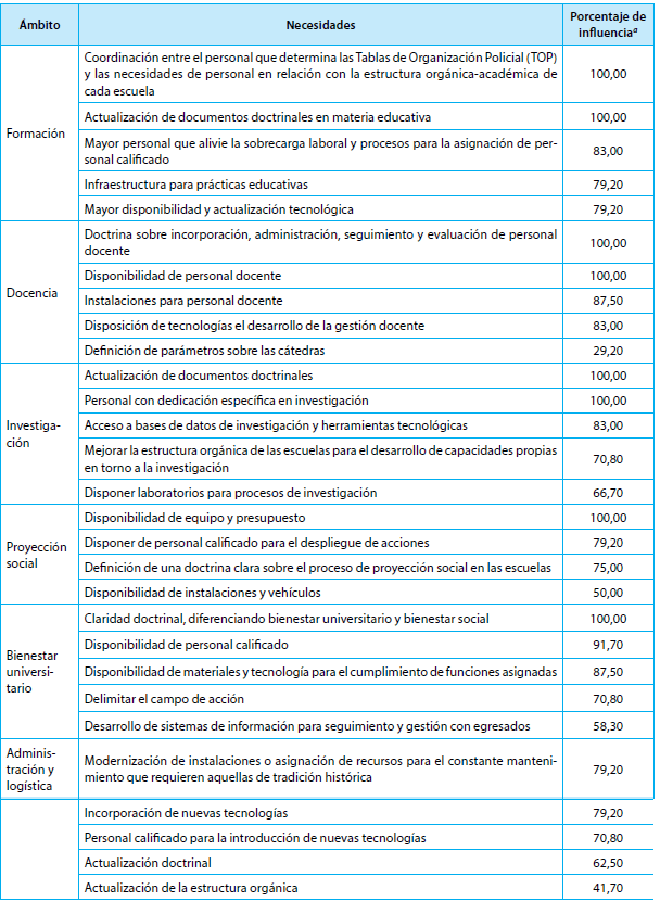 Se llevó a cabo un ejercicio de indagación sobre las necesidades coincidentes en las escuelas de formación de la Policía Nacional, buscando determinar aquellas que se presentan con mayor frecuencia. Para este ejercicio de abordaron siete ámbitos educativos propios de las escuelas. Los resultados se aprecian en la tabla 5.