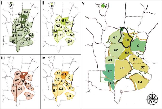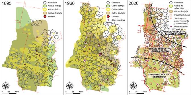 Como corolario, presentamos la síntesis de todas las actividades económicas primarias y secundarias que analizamos previamente. La actividad de servicios, desarrollada en los centros urbanos, no aparece representada por ser de escala local. Podemos interpretar, en primer lugar, una progresión en la conquista productiva del territorio: en efecto, hacia 1895, la diversidad de actividades no alcanzaba su espacio noreste, mientras que para 1960 la mixtura de las mismas era máxima. En ese entonces, tanto la agricultura como la ganadería se habían extendido hacia ese sector antes "relegado". Ya en la actualidad, parece haberse conformado una tendencia hacia la especialización productiva por sectores espaciales: el noreste es hoy predominantemente ganadero (la actividad pastoril se ve replegada hacia las tierras tradicionalmente menos aptas para cultivos, hacia 1960 la extensión ganadera era máxima, en correlato a la presencia de alfalfa), mientras que el sur es donde más extensión posee la agricultura, sobre todo sojera. La zona lechera más densa ha sido establecida en una suerte de corredor central que subsiste a pesar de los cambios en paradigmas productivos y donde la lechería sigue conformando la actividad productiva fundamental. Finalmente, en 2020 la actividad industrial aparece en distintos puntos (fig. 4).