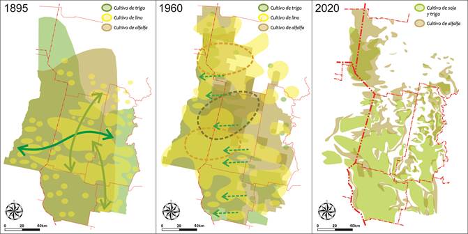 Analizar mapas productivos históricos nos permite extraer algunas conclusiones de las actividades sobre el espacio; por ello nos interesa realizar tres cortes temporales: uno hacia 1895, coincidente con el despuntar de la lechería moderna en la cuenca; otro hacia 1960, en el cual la actividad se encontraba en su apogeo en el medio del paradigma productivo lechero; y el último en nuestros días (2020), al unir el paisaje productivo regional actual a la narración histórica. En la primera serie de mapas (fig. 2) tomamos la actividad agrícola, expresada en 1895 y 1960 por cereales (trigo y lino) y forrajeras (alfalfa y sorgo), y en la actualidad por cereales (trigo), forrajeras (alfalfa y sorgo) y oleaginosas (soja). Notamos la difusión cerealera histórica sobre el espacio central y austral de la cuenca, coincidente con suelos y clima más aptos para la actividad, con una tendencia mucho más marcada en la actualidad. Hacia 1960, los cultivos tendían a correrse hacia el oeste, mientras que resulta alarmante la reducción del área con forrajeras en décadas recientes, al punto tal de ocupar casi residualmente algunos intersticios entre el trigo y la soja.
