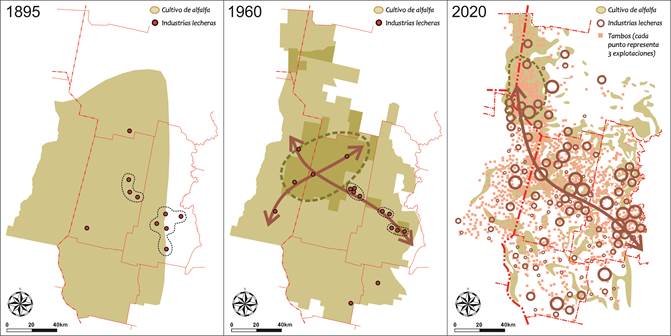 Gran simbiosis histórica ha existido entre la alfalfa y la lechería. Cuando hacia 1895 la última despegaba en su versión moderna, sus primeras iniciativas industriales se ubicaban en relación a la forrajera. Hacia 1960, con el paradigma lechero en su máximo apogeo, el nivel de correspondencia entre ambas actividades era también mayúsculo: los ejes lecheros en el centro de la cuenca se entrecruzaban allí donde la densidad forrajera era superlativa; justamente, ello permitió una mayor difusión tambera. Finalmente, en nuestros días, el eje industrial lechero refuerza su presencia aún a pesar de que la alfalfa se ha visto reducida en el espacio productivo. La densidad tambera más alta sigue al eje industrial (fig. 3).
