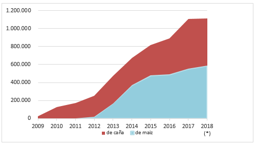 La producción de diesel de soja en Argentina tuvo un crecimiento espectacular y su producción se expandió a medida que se incrementaba la demanda interna (con ampliaciones del cupo nacional) y la externa, llegando hasta el pico de 2,5 toneladas en el año 2018 (con una capacidad instalada para 4,5 millones), y un consumo local de 1,1 toneladas (con el corte establecido en el 10%). Por su parte, el maíz exhibió en la última década un aumento sostenido, diputando a la soja el título de cultivo de mayor producción en el país. Su evolución permite visualizar que mientras en 2010/11 la cosecha fue de 23 millones de toneladas, la curva ascendente trepó en 2019/20 a 58 millones de toneladas (Gráfico 2). Paralelamente se observa el creciente destino del maíz a combustible desde el año 2012 (Gráfico 4), cuando se constata que la cantidad de alcohol, elaborado hasta entonces con caña de azúcar, no era suficiente para proveer al corte nacional de etanol establecido por ley (Toledo López 2013, 2018).