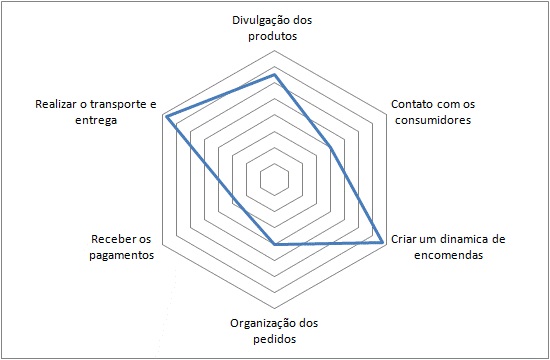 Assim, ainda que pareça algo bastante simples, é um processo que envolve uma série de adaptações, por isso foram coletados dados sobre o processo de adaptação e dificuldade dos agricultores familiares nesta nova dinâmica. De acordo com 90% dos interlocutores, esta forma de comércio é mais trabalhosa do que a comercialização na feira. O gráfico 2 ilustra os resultados sobre o nível de dificuldade de cada etapa, sendo as mais desafiadoras a criação da dinâmica de encomendas e a realização das entregas, sendo seguidas pelo recebimento dos pagamentos.