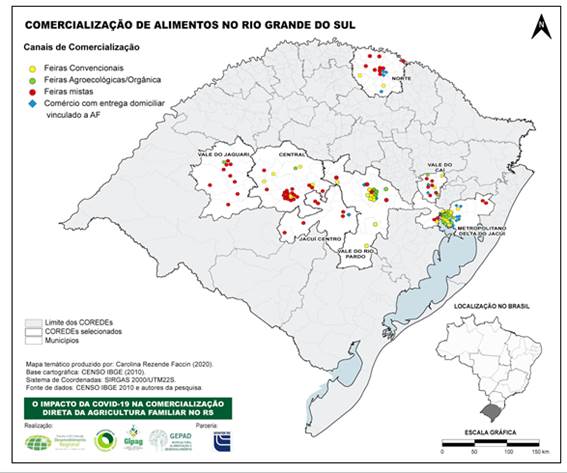 Este estudo é fruto de uma pesquisa de caráter exploratório com a coleta de dados qualitativos e quantitativos. O trabalho partiu de um mapeamento dos canais de comercialização, em especial feiras e venda com entrega domiciliar vinculados à agricultura familiar, tendo como fonte de dados pesquisas previamente realizadas pelos membros da equipe de pesquisadores, sites de prefeituras e iniciativas cadastradas na plataforma “Mapa de Feiras Orgânicas”. A identificação dos canais de comercialização também contou com o apoio e participação dos escritórios regionais e municipais da Emater-RS/ASCAR, que através do envolvimento de seus extensionistas rurais, facilitaram o contato com os gestores das feiras.