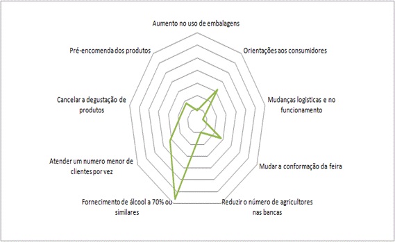 Outra medida bastante comum foi à alteração da conformação física da feira, aumentando o espaçamento entre as bancas de forma a minimizar aglomerações entre consumidores. Muitos feirantes, em especial aqueles com facilidade de uso de redes sociais, passaram a incentivar a realização de pré-encomendas dos produtos, reduzindo o tempo de interações na feira apenas para retirada dos produtos.