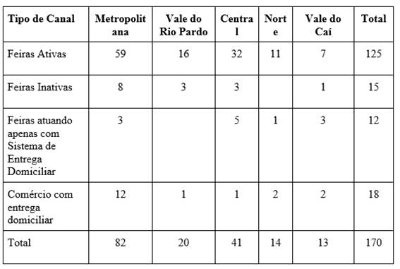 Em termos quantitativos, a região Metropolitana se destacou com 82 canais de comercialização, seguida da região Central com 41, conforme detalhado na tabela 1. Na Região do Vale do Rio Pardo foram identificadas 16 feiras em funcionamento, três feiras inativas e um ponto de comercialização que passou a fazer entrega domiciliar de alimentos. Já no Vale do Caí, constataram-se sete feiras ativas, uma feira inativa e três feiras e um comércio de alimentos que passaram a fazer entregas domiciliares. Na região Norte, 11 feiras permaneciam ativas, sendo que dessas, duas também passaram a atuar com entregas domiciliares. E também se verificou que dois empreendimentos comerciais passaram a realizar entregas domiciliares de alimentos. No que diz respeito aos períodos de funcionamento das feiras, não é possível estabelecer um padrão visto que no conjunto há uma variedade de situações, tendo feiras com ocorrência nos diferentes turnos do dia (manhã, tarde e noite) e em distintos dias da semana.