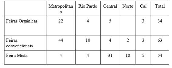 Entre os casos estudados, a única região que não apresentou esta alternativa foi a do Vale do Rio Pardo, tendo um número variável de casos ocorridos nas demais regiões. De forma comparativa, a Região Central foi a que apresentou maior número de feiras atuando nessa modalidade (cinco), ainda que em termos de município o destaque ficou para Porto Alegre que apresentou três experiências de feiras agroecológicas atuando desta maneira.