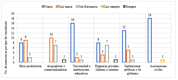 Como puede observarse, las mayores vinculaciones se generan con acopiadores o comercializadores, así como con otras empresas del ramo transformador (industria alimentaria salsera), aunque de forma mesurada, con respuestas de ‘siempre’ (2 respuestas) y ‘con frecuencia’ (en muy pocos casos) ya que estas articulaciones se han presentado solamente en 7 casos respectivamente. Sin embargo, es de particular interés los percibidos extremos de la vinculación, ya que la ausencia de articulación se ha presentado con mayor intensidad con asociaciones civiles (por un desconocimiento de la naturaleza del actor o las funciones del mismo), con universidades o centros educativos (en ocasiones generados por las divergencias de los intereses participativos) y finalmente, con instituciones públicas o entidades de gobiernos debido a que continua existiendo una falta de continuidad política, cambios en la administración en turno o desconfianza en el cumplimiento de los acuerdos.