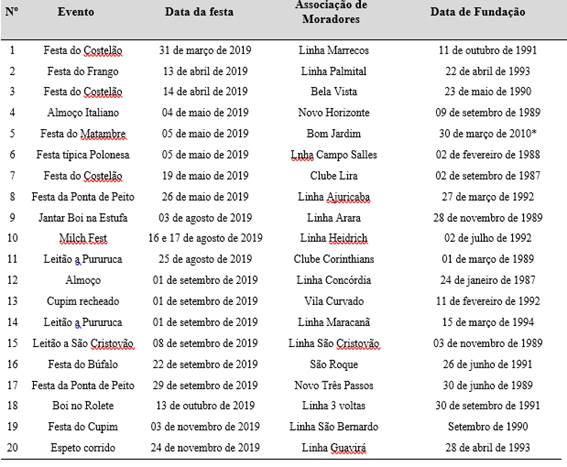 Para a pesquisa privilegiou-se a análise das vinte festas gastronômicas que ocorrem na zona rural do município, conforme abaixo discriminadas no Quadro 1, descrevendo o nome da festa, a data de realização do evento no ano de 2019, a associação de moradores em que aconteceu e a data de fundação da associação de moradores.