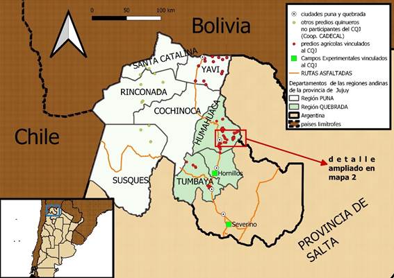 Durante el año 2014, se realizó una encuesta en las regiones de Puna y Quebrada para identificar numéricamente las características de la producción de quinua en la región NOA. Estos datos constituyeron la base para los diagnósticos de las intervenciones llevadas a cabo. Allí se identifica un total de 195 establecimientos (75 en la Quebrada y 120 en la Puna) que producían quinua, empleando para ello una superficie total de 58 hectáreas (Roisinblit et. al., 2015). Para la campaña agrícola previa (2013), esta misma encuesta había identificado 49 unidades produciendo 84 toneladas de grano sobre una superficie total de 38 hectáreas (Daza et.al., 2015), por lo cual la expectativa de cosecha que preveía el Complejo Quinua para ese mismo año 2015 era de 128 toneladas de grano de quinua si el rendimiento se mantenía constante, o bien de hasta 232 toneladas, si se daban las condiciones logradas en el campo experimental de INTA (Agüero; Acreche y Aguiar 2015) en la Quebrada de Humahuaca. Cabe aclarar que las condiciones agroecológicas de los campos de ensayo y los predios familiares de producción son muy similares.