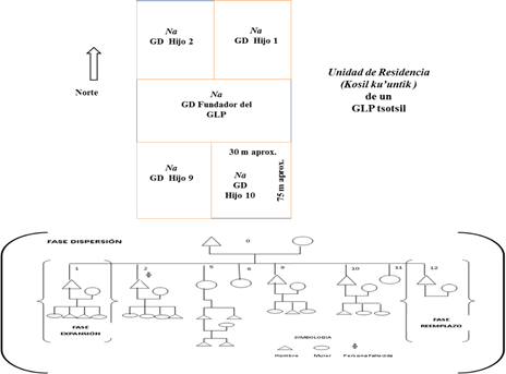 La figura 2 ilustra las distintas fases del proceso de reproducción social en cuestión representado en la composición genealógica de un grupo localizado de parentesco tsotsil y la organización territorial de su unidad de residencia, que expresa un proceso de residencia patrilineal ya concluido. Así, en la reproducción social del grupo, implícita en sus relaciones sociales, media una territorialidad (Saquet 2015, 104) manifiesta en los espacios de vida lindados de los grupos domésticos que lo integran.
