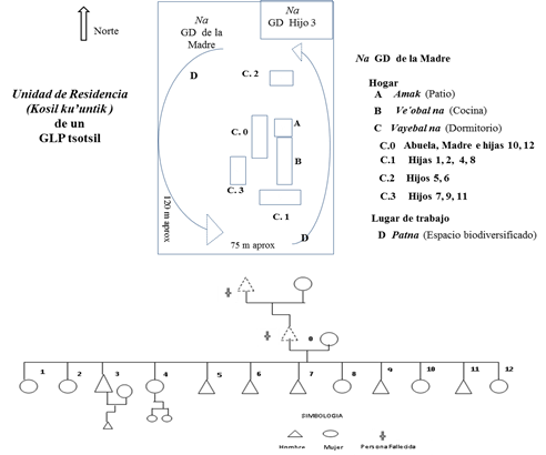 La casa tsotsil, nombrada Na, se articula como región a la sede de la unidad de residencia, que es el lugar donde intersectan las actividades de rutina de los miembros del Grupo de parentesco, a la vez constituye una sede que alberga las actividades diarias del grupo doméstico. De modo que, las prácticas sociales de esta unidad social se sitúan en ambas sedes. Así, la territorialidad cotidiana del grupo doméstico, situada en el espacio de Na, escala a una territorialidad cotidiana en el espacio de la unidad de residencia, que es colectiva y articuladora de actividades de miembros del Grupo, vinculadas a encuentros para el trabajo colaborativo, reuniones de convivencia, etc.