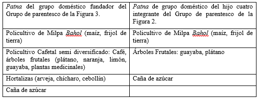 El proceso de biodiversificación que configura al patna va a la par del desarrollo del grupo doméstico, mediado por un conocimiento que se va adquiriendo o Kich’tik chanumtasel, “recibimos enseñanza”. Generalmente, el patna del grupo doméstico fundador del grupo de parentesco exhibe gran densidad de cultivos y policultivos en comparación al patna recién formado de un hijo casado. Tal diferencia es ilustrada en el siguiente cuadro.