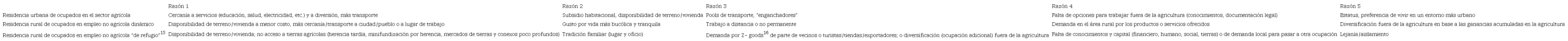 Bastante se ha escrito en la región a partir de la década de 1990 sobre la nueva ruralidad, el empleo rural no agrícola y la necesidad de no confundir “rural” con “agrícola”.14 En el cuadro 3 se vaticinan algunas de las razones por tener una ocupación agrícola y una residencia urbana, o una ocupación no agrícola y una residencia rural.