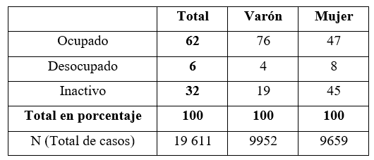 En este marco económico es posible comprender la situación laboral de los jóvenes6 del cinturón verde. Se toman datos del último Censo Nacional de Población, Hogares y Viviendas (CNPVyH) (Instituto Nacional de Estadísticas y Censos 2010), que señala que el 62% de los jóvenes se encontraba trabajando, mientras que un 6% no estaba ocupado pero estaba en búsqueda de uno (cuadro 1). Respecto a la desocupación, debe considerarse que impacta más sobre las mujeres, llegando a duplicar a la desocupación de los varones.