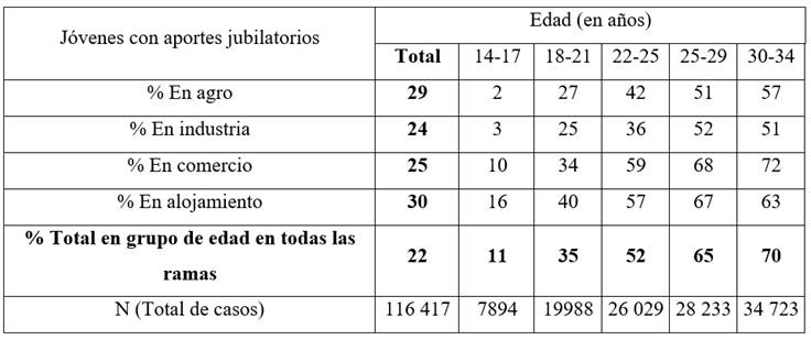En el cuadro 4 se puede evidenciar los niveles de formalidad en el trabajo considerando si los jóvenes cuentan con aportes jubilatorios. La situación varía a lo largo de los rangos de edad: los adolescentes cuentan con escasos aportes, considerando que el registro del trabajo recién comienza a los 16 años según la legislación vigente. La escasa formalidad se presenta también para aquellos de más de 18 años en todas las ramas. Es la rama agropecuaria la que presenta valores más bajos de formalidad para todos los rangos.