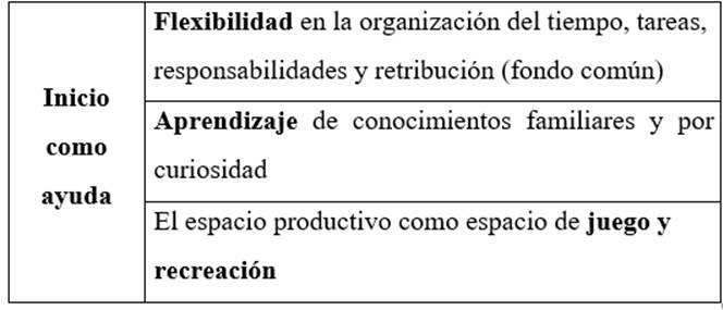 Desde el análisis de las entrevistas se ha podido identificar dos modos en que los jóvenes relataban sus inicios en la vida productiva aun siendo en una misma actividad. En primer lugar, por medio de la ayuda a sus familias, en un marco de cuidado y flexibilidades. En segundo lugar, como trabajo con condiciones de inflexibilidad y la necesidad signando sus experiencias. En los próximos dos apartados se ahonda en cada uno de ellos.