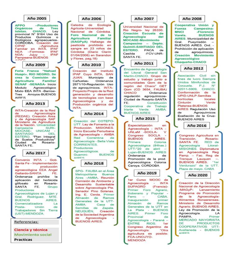 En la ciencia pos normal (Funtowicz y Ravetz 1996) hablábamos de la transdisciplina, pero la tarea no es solo de expertos individuales, sino más bien recae en una comunidad extendida que evalúa, y gestiona la calidad de los imputs científicos en procesos complejos de toma de decisiones en un proceso social integrador como una oportunidad de resolución autentica. Estos hitos dan cuenta de dicha comunidad a través de la diversa participacion de Organizaciones sociales a través de sus líderes e integrantes , asociaciones profesionales que legitiman el paradigma, medios de comunicación que difunden , instituciones educativas de los tres niveles que lo enseñan a sus alumnos, organismos del Estado nacional, provincial y municipal que oficializan e implementan en su estructura y programas de investigación y extensión, referentes locales e internacionales en la temática, foros de discusión interdisciplinarios , colectivos sociales que concuerdan con los principios, apoyo económico de organismos financieros nacionales e internacionales a la investigación para su desarrollo y escalamiento. Si bien hay muchos hitos más en la historia del camino inicial de la agroecología en nuestro país, como el CENECOS (Centro de Estudios de Cultivos Orgánicos) en 1985, El CEDEPO (Centro Ecuménico de Educación Popular); CETAAR (Centro de Estudios de Tecnologías Apropiadas de Argentina) ò el programa PROHUERTA (Convenio INTA-Ministerio de Desarrollo Social de la Nación) en 1990, este último aún en plena vigencia, por citar algunos puntos importantes en la proyección del nuevo paradigma, presentamos a continuación una línea de tiempo con algunos principales hitos divididos con colores según ciencia, practica o movimiento, concordantes con respuestas concretas que marcan una tendencia al cambio.