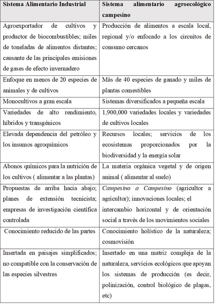 En el cuadro 1 podemos ver una comparación del sistema alimentario agroindustrial versus el agroecológico campesino. Los sistemas alimentarios de carácter campesino y agroecológico basados en circuitos de producción y consumo locales, difieren considerablemente de las cadenas de alimentos industriales.