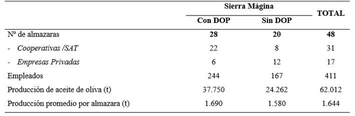 A nivel de transformación, se encuentran registradas 48 almazaras, de las cuales 31 son cooperativas o Sociedad Agraria en Transformación (SAT) y 17 empresas privadas. La producción total de aceite de oliva alcanza las 62.000 t promedio, de las cuales el 60% es aportado por almazaras con DOP18 (Tabla 1). El número de empleados asciende a 411, de los cuales sólo el 27% son de tipo fijo y el 73% corresponden a la categoría Fijo-Discontínuo.