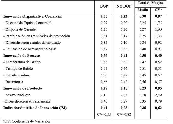 El Indicador Sintético de Innovación (ISI) de Sierra Mágina arroja en promedio un valor de 0,36, con una fiabilidad aceptable19. Entre sus componentes se destaca la innovación de proceso (0,50), seguida por la organizativa-comercial (0,30) y, por último, la innovación de producto (0,23). La innovación en procesos no sólo es el tipo de innovación más importante, sino también la más homogénea entre las almazaras, con un Coeficiente de Variación (CV) de 0,40 frente a valores de 0,95 y 0,97 en el CV de innovación en producto y en aspectos organizativos-comerciales, respectivamente (Tabla 2).